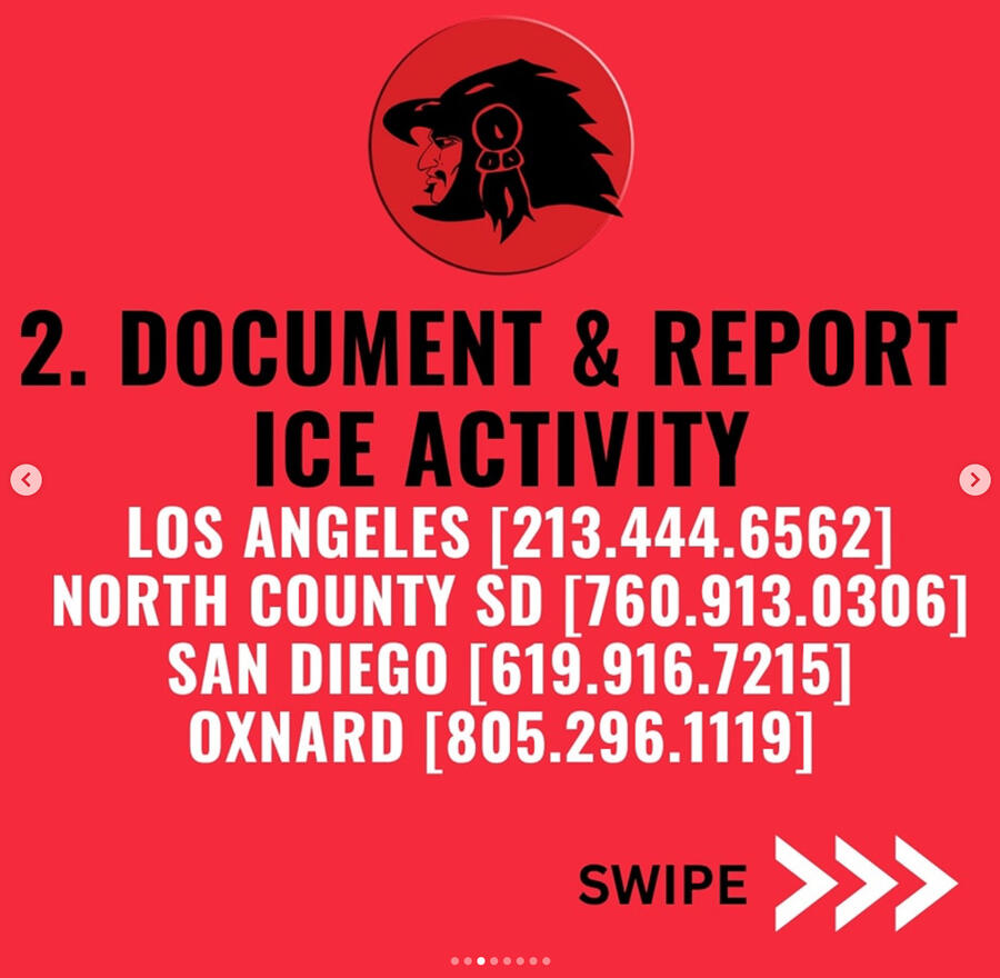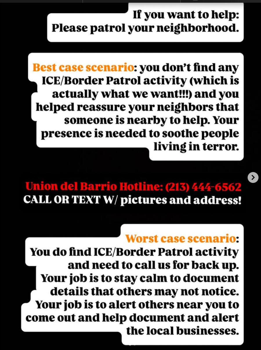 +1 (213) 444-6562Remember: do not say ICE is in the area and leave. Support community and stay to ensure everyone is safe and so that you can report that ICE is actually in the area.